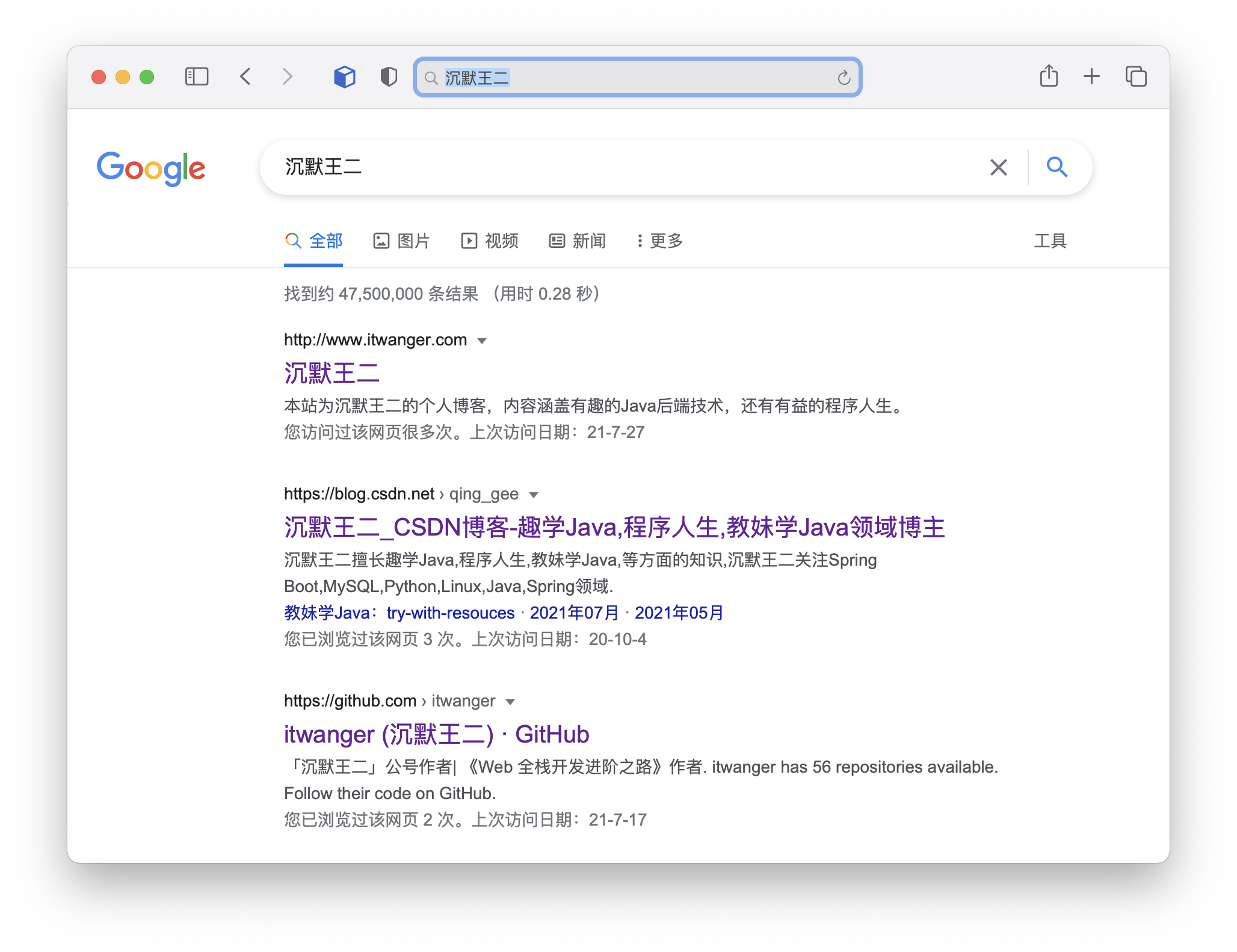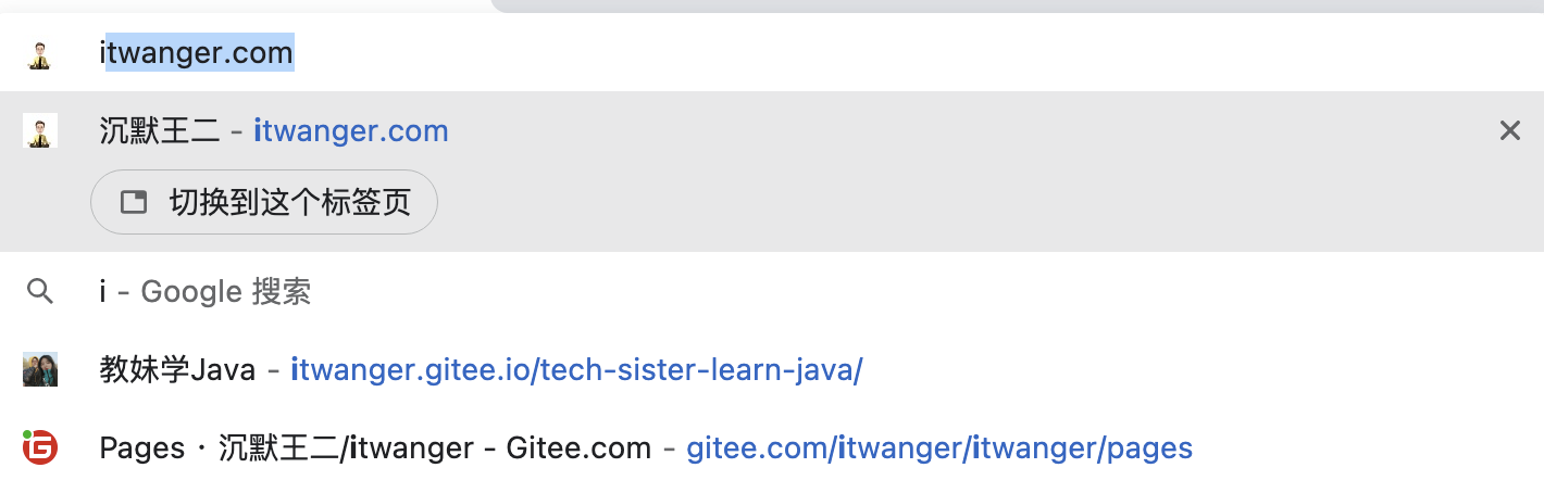 大概过了三四个小时吧,我无意在谷歌浏览器地址栏敲入 i 的时候, 出现了 itwanger.com 的选项(我之前访问过,所以有记录)。